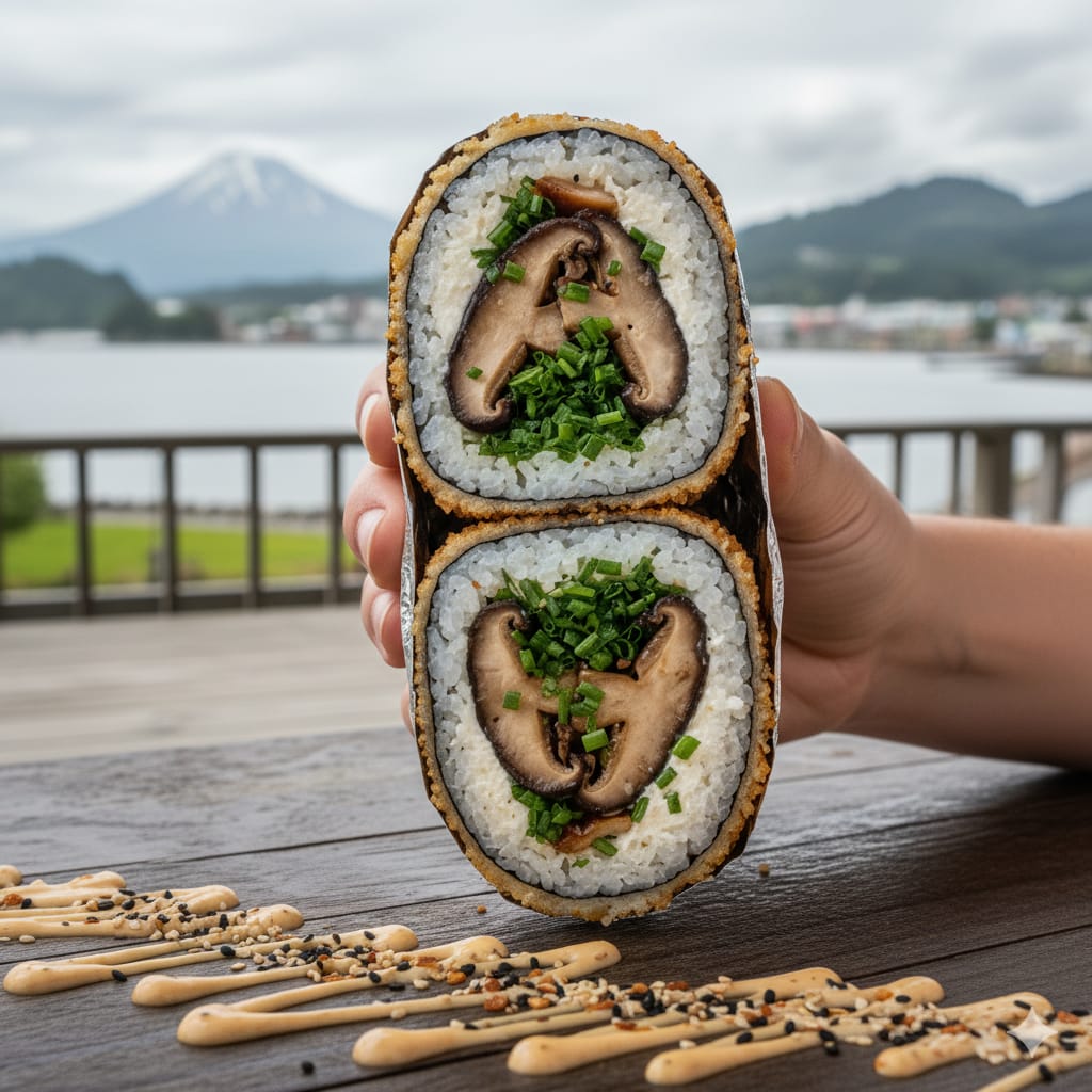 Cono de alga nori con arroz de sushi, champiñones salteados, cebollín y queso crema. La opción vegetariana que conquista con sabor y textura en cada bocado.