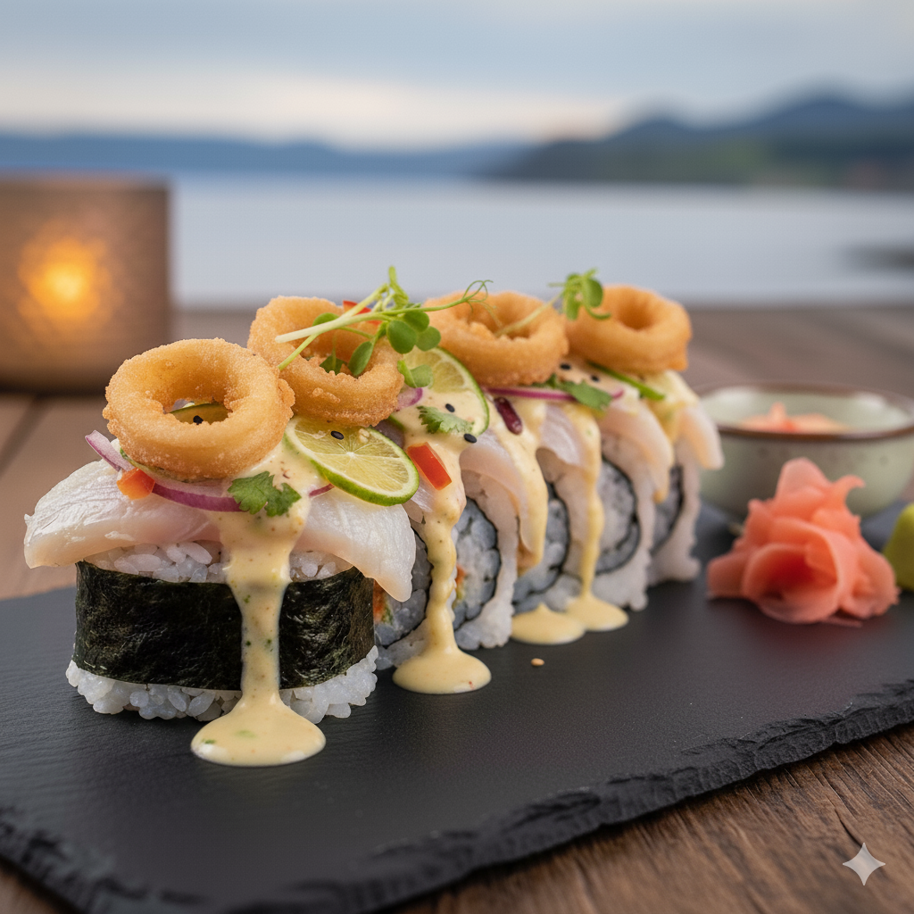 Roll de arroz con salmón fresco, palta cremosa y acevichado de calamar, finalizado con sésamo tostado y ciboulette. 10 piezas de sabor marino intenso.