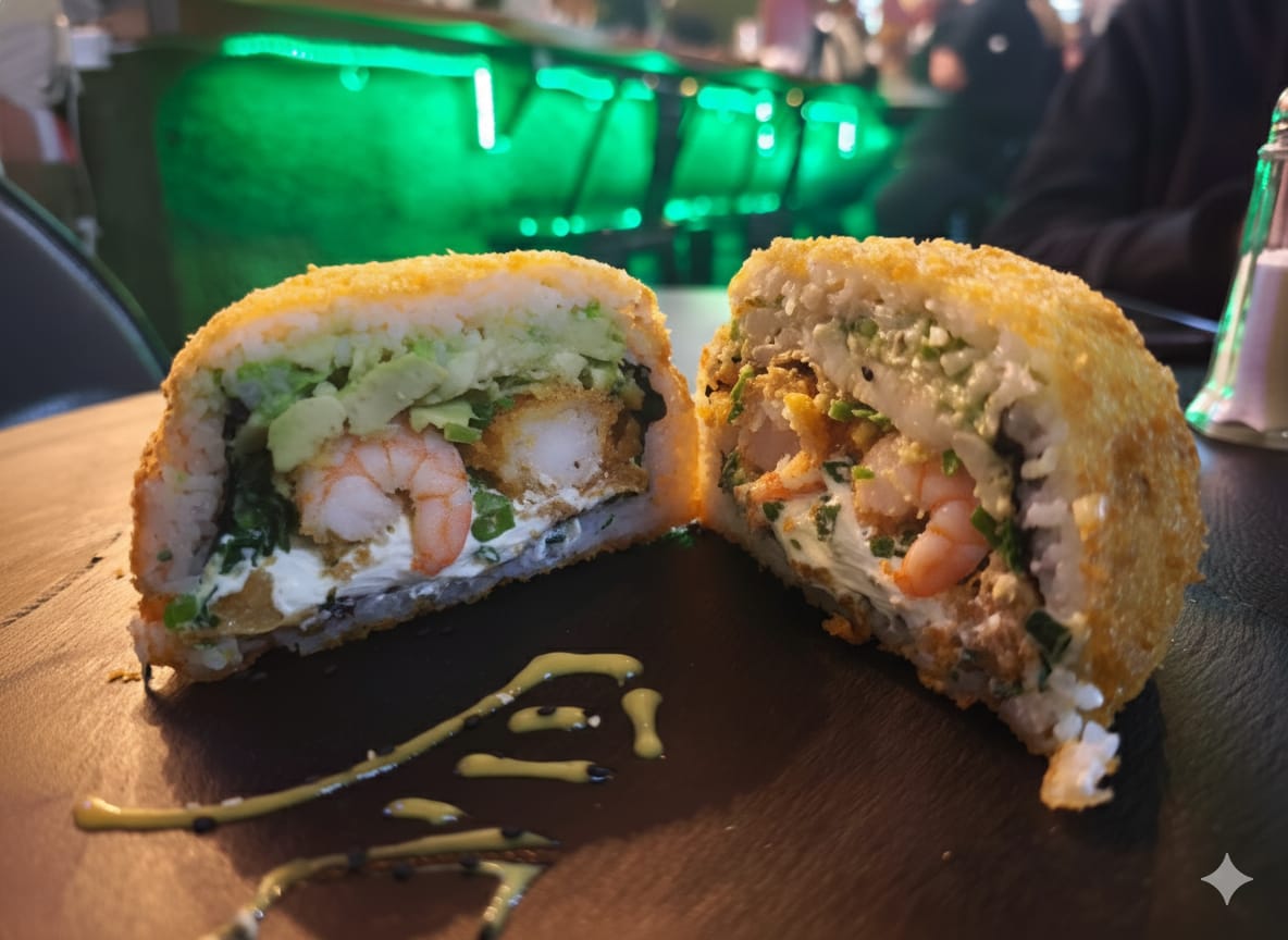 El encuentro perfecto entre dos mundos: arroz y alga nori con palta, queso crema, cebollín y camarones jugosos. La hamburguesa que Japón le regaló al fútbol.