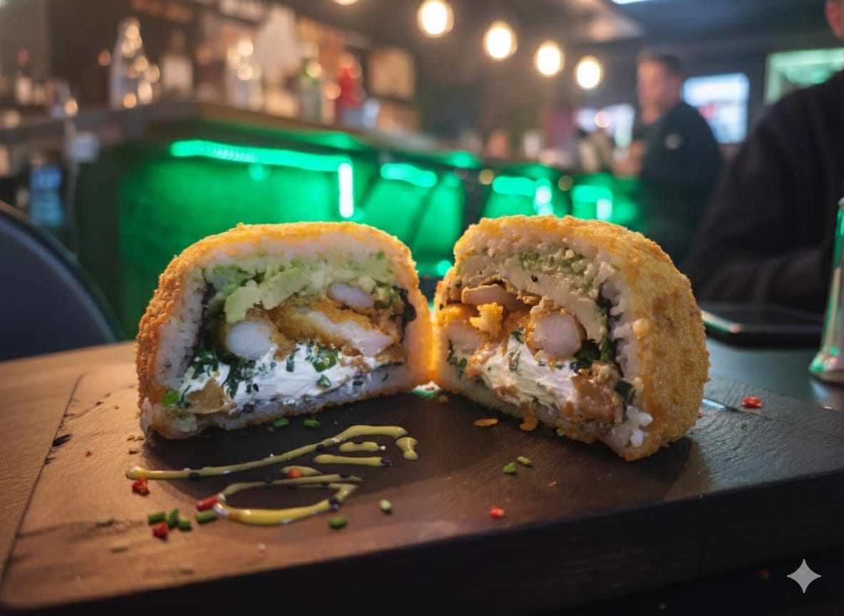 Hamburguesa reinventada con arroz y alga nori, rellena de palta, queso crema, cebollín y jugoso pollo. Fusión audaz entre Japón y América que rompe las reglas.