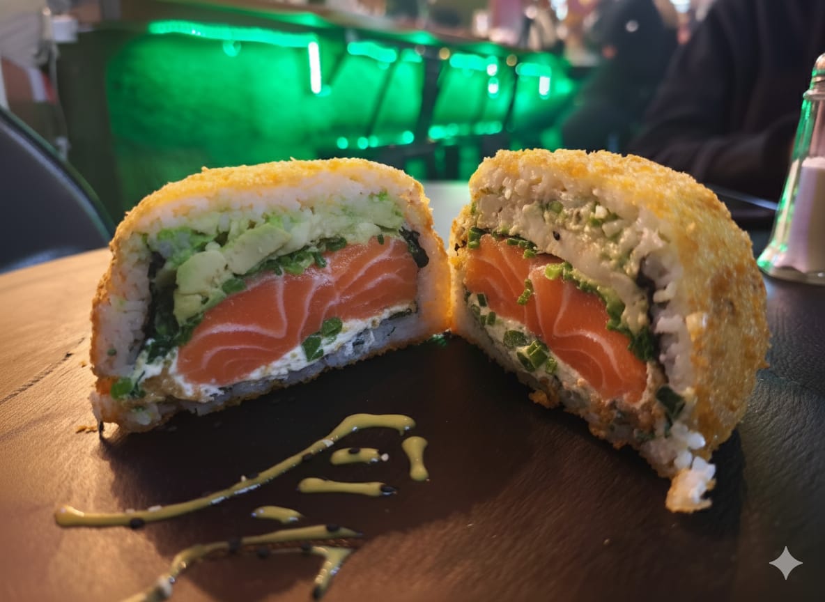 Hamburguesa reinventada con arroz y alga nori, rellena de palta, queso crema, cebollín y salmón fresco. Fusión audaz entre Japón y América que rompe las reglas.